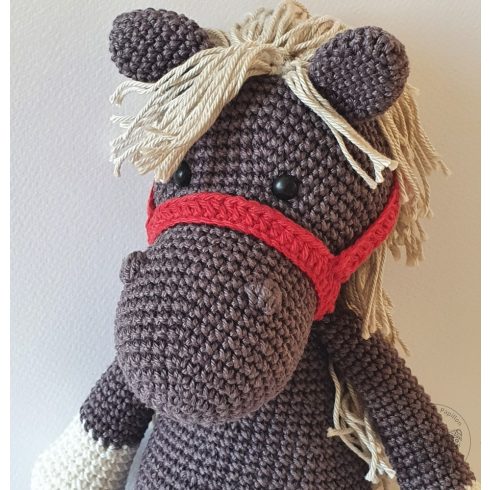 Csokibarna testén piros kantárja megragadja a szemet.